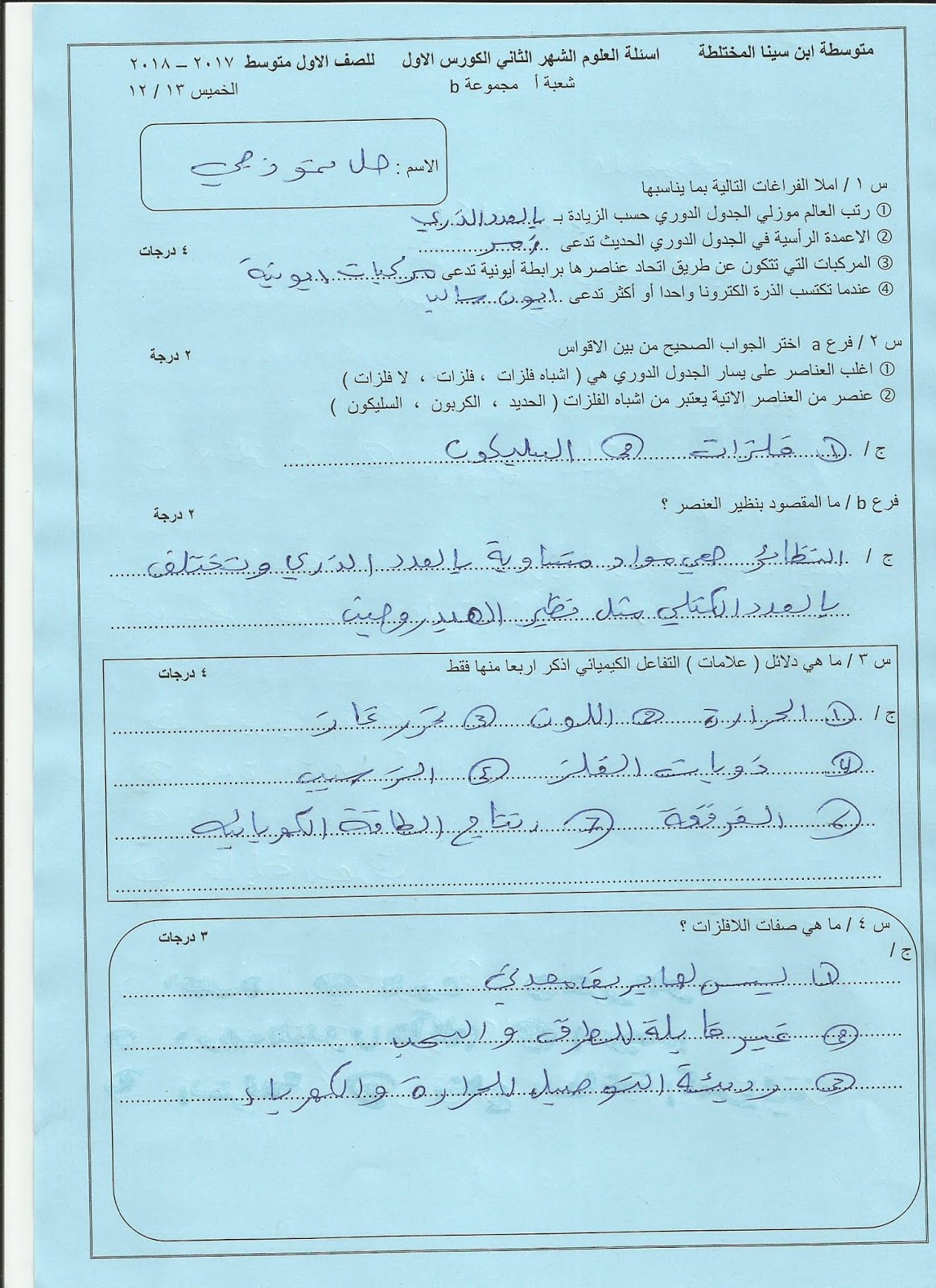 اسئلة العلوم 2017 الاول متوسط نهاية الكورس الثاني Youtube