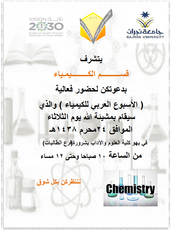 دعوة لحضور فعاليات كلك كيمياء بمناسبة الأسبوع العربي للكيمياء الكيمياء كلية العلوم التطبيقية جامعة أم القرى