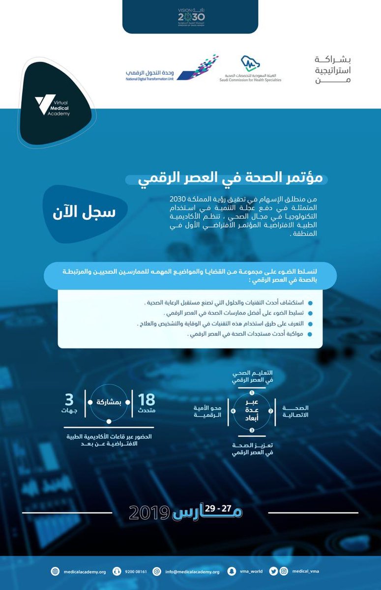 ملتقى المعلوماتية الصحية On Twitter أول مؤتمر صحي عن بعد مؤتمر الصحة في العصر الرقمي عبر الأكاديمية الطبية الافتراضية وبشراكة استراتيجية مع الهيئة السعودية للتخصصات الصحية ووحدة التحول الرقمي التابعة